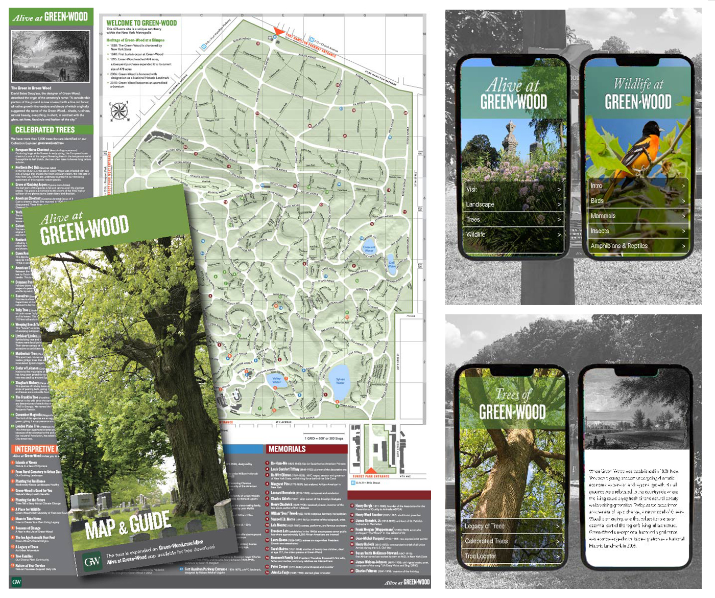 In 2016-2017, Whirlwind did an interpretive master plan for Greenwood and designed and produced a detailed visitor guide with key landscape, architectural and natural history locators. In addition, an APP, Alive at Greenwood, was developed to include a guide to key flora and fauna to the 428 acre cemetery.Outdoor markers featuring 12 different themes were strategically placed on-site.